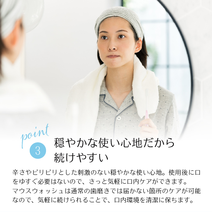 ご使用前によく振ってください。適量(キャップ1杯分)を口に含み30秒ほどすすいでから吐き出してください。水で口をすすぐ必要はありません。