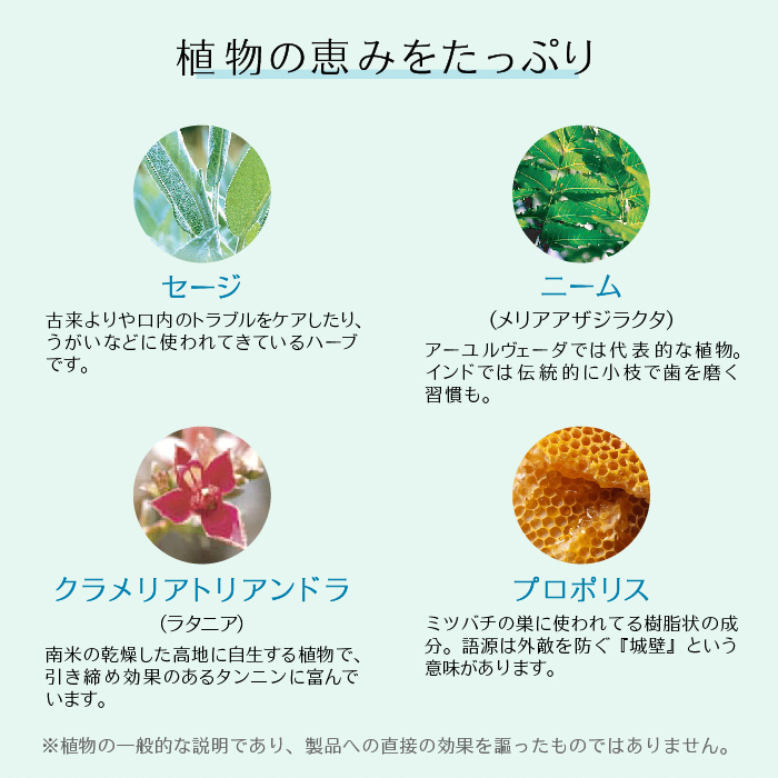 お口のトラブルの原因となる汚れやネバネバをすっきり洗い流します。セージのシャープな香りでお口の中はすっきり。