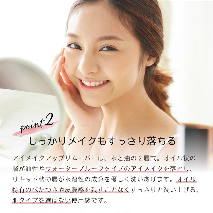 ポイントメイクリムーバーとしてお使いいただけます。水と油の2層式で、アイメイクやポイントメイクを優しく落とします。100%天然由来ながらウォータープルーフメイクを落とします。
