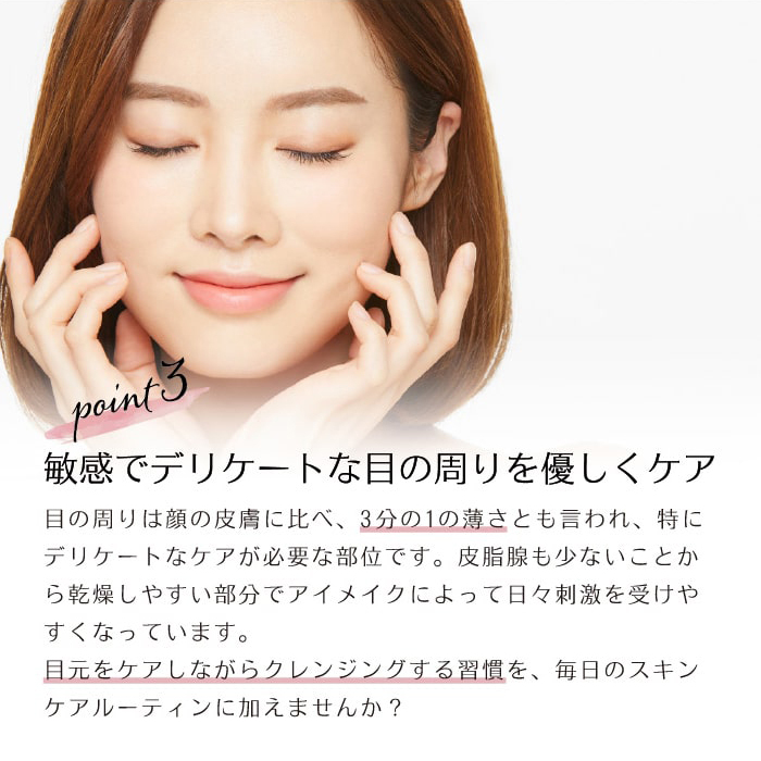 オイル特有のべたつきや皮膜感が残りません。ピリピリしないで穏やかな使用感で、目元をスキンケアしながらメイクをオフしていきます。目元が敏感で乾きやすい方も安心してお使いいただけます。