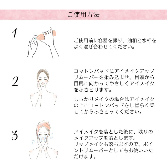 ご使用前に容器を振り、油相と水相をよく混ぜ合わせてください。コットンパッドにアイメイクアップ リムーバーを染み込ませ、目頭から目尻に向かってやさしくアイメイクをふきとります。しっかりメイクの場合はアイメイクの上にコットンパッドをしばらく乗せてからふきとってください。アイメイクを落とした後に、残りのメイクアップを落とします。