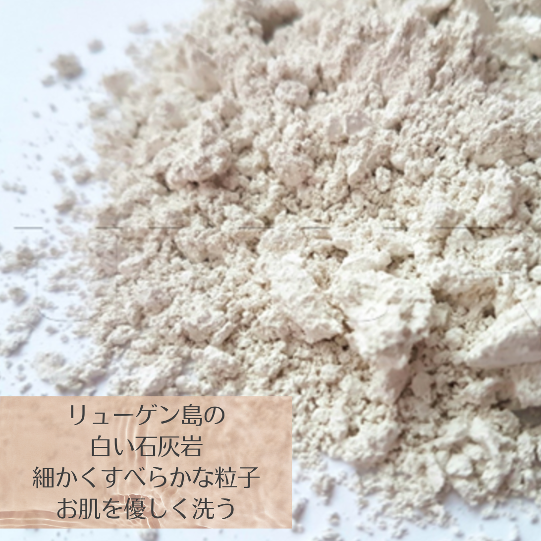 キー成分としては、バルト海に面するリューゲン島で自然と7000万年もの膨大な年月が育んだ白い石灰岩です。北ドイツのリューゲン島の白い石灰岩の崖からからのみ採取されて、抽出できる原料であり、シルクのように白く、まじりけがなく、細かな粒子がすべやかで、透明感あるお肌に整えます。汚れや余分な皮脂を吸着する表面積が大きいことで洗浄力にすぐれていますが、粒子自体は小さいため、洗い流しやすく、優しく汚れをオフすることのできる成分となっています。